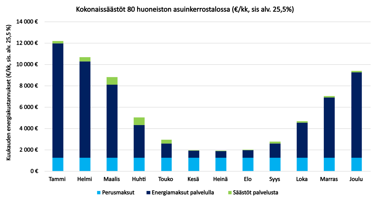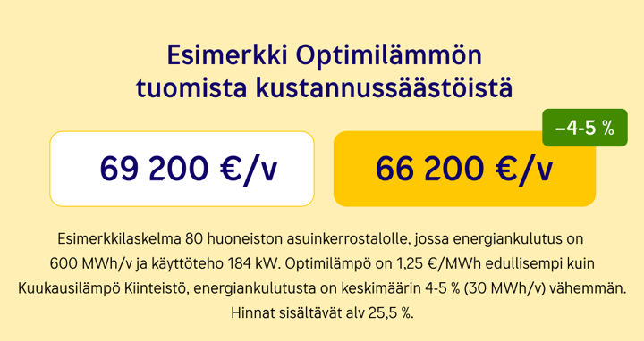 - Kuukausilämpö Kiinteistö -tuotteeseen nähden taloyhtiö säästää lämmityskustannuksissa keskimäärin 4–5 %, sillä Optimilämmön oppiva algoritmi ohjaa taloyhtiön energiankulutusta ennakoivasti säätilan ja sääennusteiden perusteella.