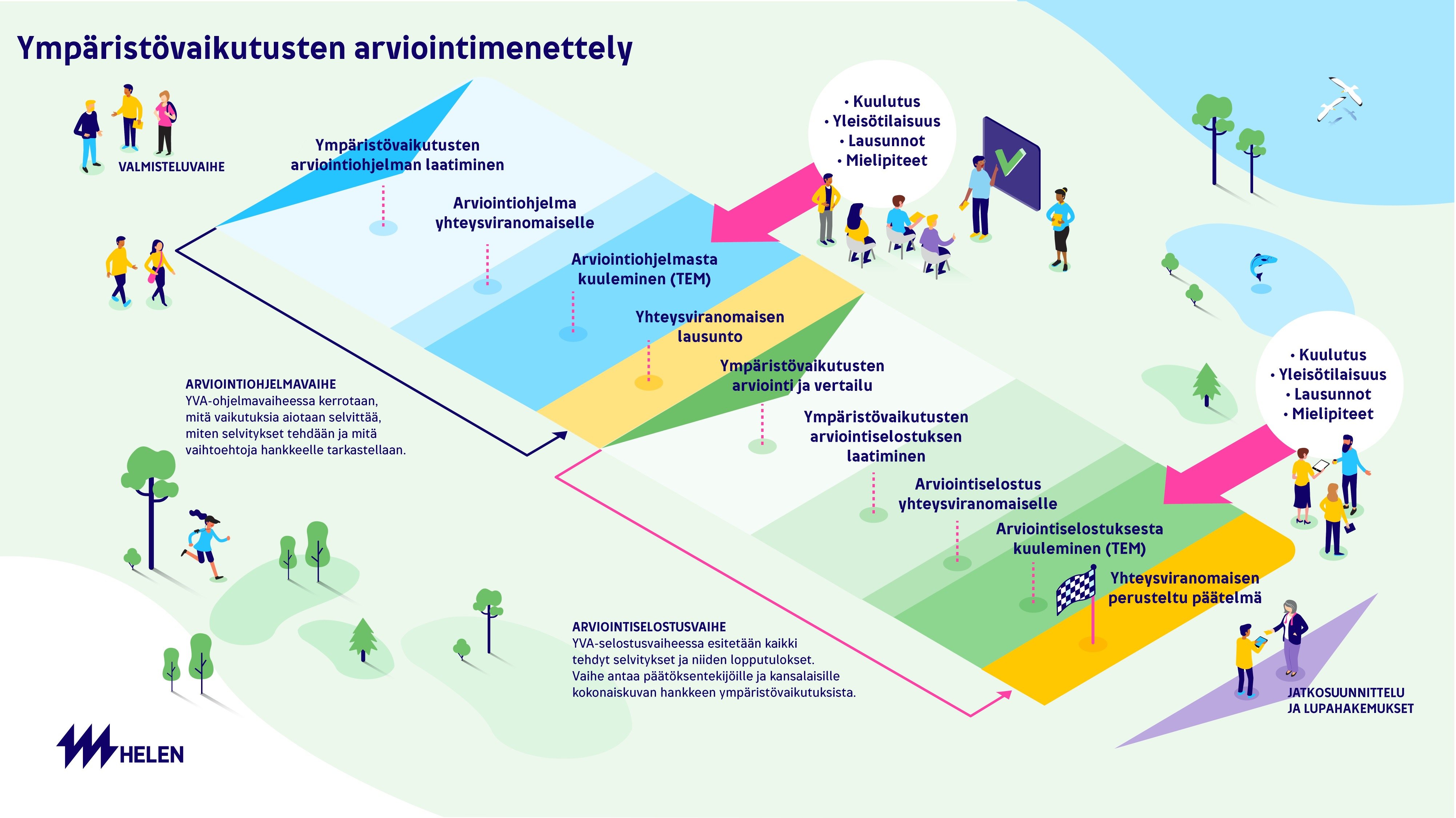 Valmistuttuaan hankkeen YVA-ohjelma ja -selostus asetetaan julkisesti nähtäville, ja kaikilla on mahdollisuus jättää näistä lausunto tai mielipide. Tässä yhteydessä yhteysviranomaisena toimiva Työ- ja elinkeinoministeriö (TEM) tulee järjestämään myös kaikille avoimia yleisötilaisuuksia. TEM kokoaa annetut asukkaiden ja järjestöjen mielipiteet ja viranomaisten lausunnot ja laatii niiden sekä oman asiantuntemuksensa pohjalta lausunnon arviointiohjelmasta ja perustellun päätelmän arviointiselostuksesta. YVA-menettelyssä tuotettua tietoa tullaan hyödyntämään hankkeen luvituksessa sekä tukemaan Helenin päätöstä valittavasta laitospaikasta.