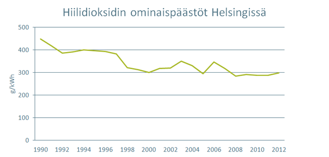 Helsingin alueen energiantuotannon hiilidioksidin ominaispäästöt. Kaiken Helsingin Energian tuottaman energian ominaispäästöt ovat alhaisemmat, kun mukaan lisätään ydinvoima- ja vesivoimaosuudet.