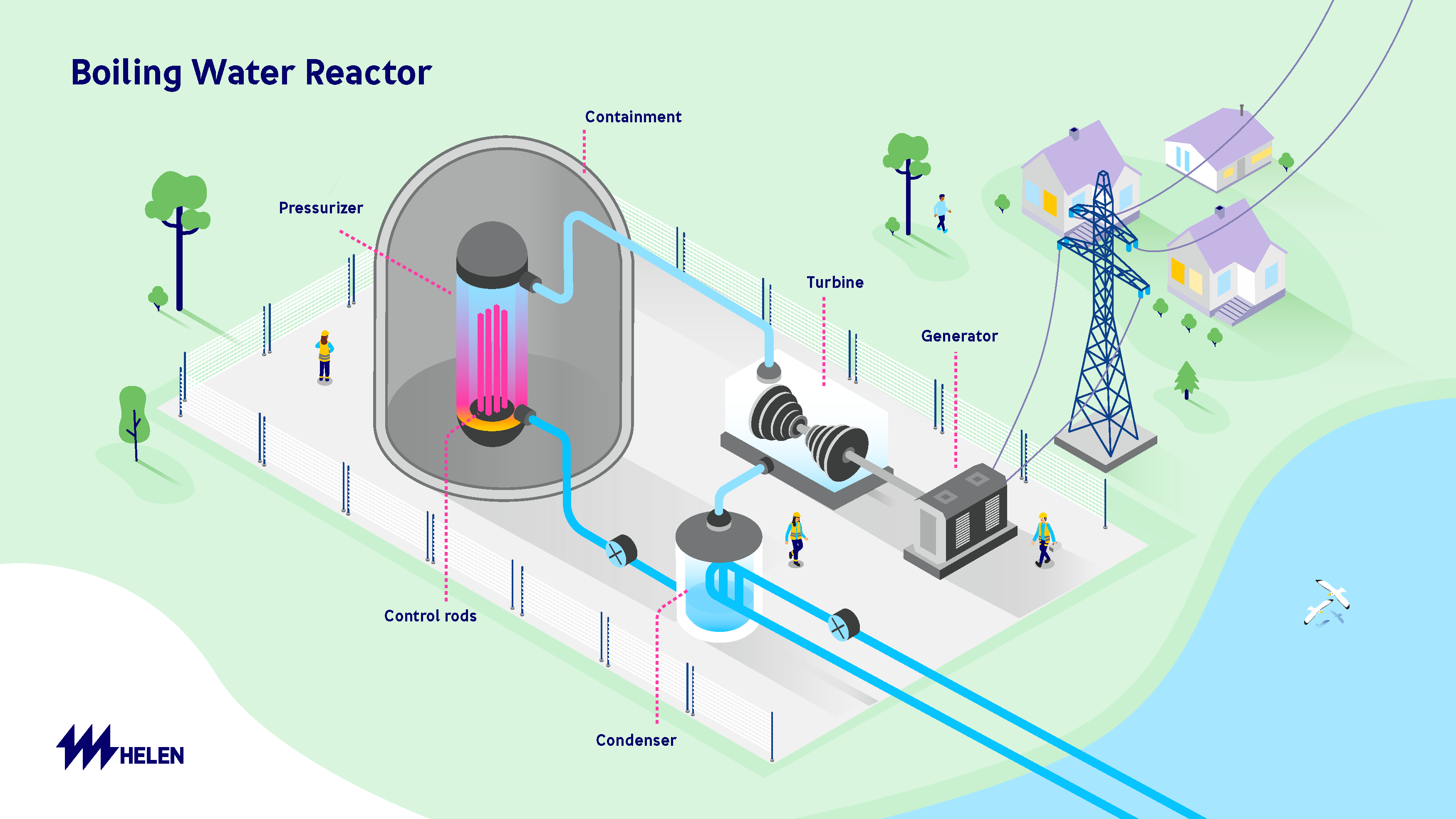 In a boiling water reactor, the water inside the reactor core boils directly. The resulting steam is routed straight to the turbine without a separate steam generator. After the turbine, the steam is cooled back into water and returned to the reactor in a closed-loop system.