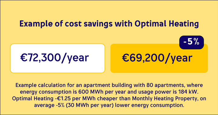 - Compared to the Monthly Heating Property product, the housing company saves on average 4–5% in heating costs, as Optimal Heating’s learning algorithm proactively controls the housing company’s energy consumption based on the weather at that moment and weather forecasts.