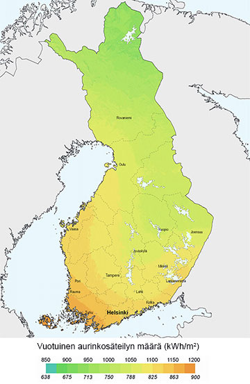 In southern Finland, the annual output of a 1,100 Wp solar power system at a 30–45-degree angle amounts to about 900 kWh per year. The total annual output in the southern parts of Finland is about the same as in northern Germany. Use our calculator to see your output potential.