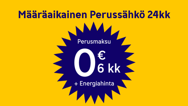 Tilaa nyt Määräaikainen Perussähkö (24 kk) ja saat perusmaksut 0€ 6 kk ajan (normaalisti 5,99 €/kk). Tarjous koskee vain perusmaksua.
